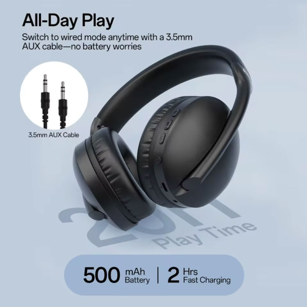 Met de 500mAh batterij biedt de S6001 tot wel 20 uur afspeeltijd. Is de batterij leeg? Geen probleem — sluit simpelweg de meegeleverde 3,5 mm AUX-kabel aan en luister direct verder.
