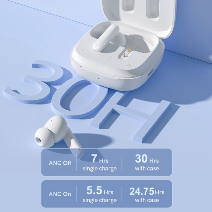 Uitzonderlijke Batterijduur: Laat de muziek doorgaan met een batterijduur van maar liefst 30 uur in combinatie met de oplaadbox. Schakel ANC uit voor een indrukwekkende gebruiksduur van 7 uur met alleen de oortjes. Met ANC ingeschakeld geniet je van 25 uur met de oplaadbox en 5.5 uur zonder.