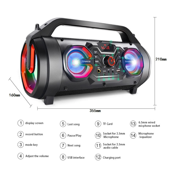 De kleine luidspreker ondersteunt Bluetooth, 3.5mm AUX-kabel, TF-kaart en FM radio voor audiostreaming. Je kan ook gebruik maken van een microfoon dankzij de 3.5mm en 6.5mm microfoon aansluitingen.