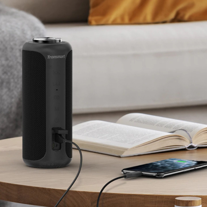 De speaker is compleet IPX6 splash-proof, zo kan deze perfect buiten in de regen gebruikt worden. Voor het opladen maak je gebruik van de meegeleverde USB-C kabel.