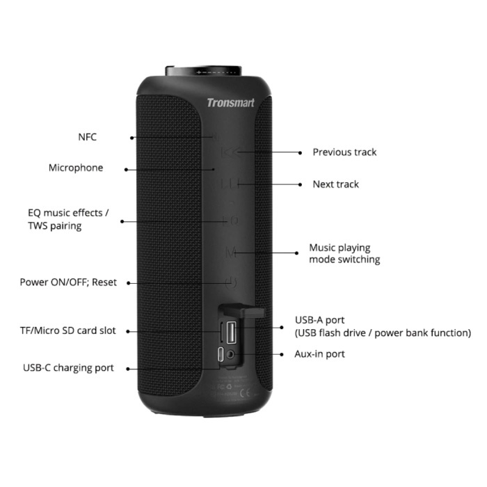 | Pakket bevat: | 1x T6 Plus Soundbox 1x Opbergtas 1x USB Oplaadkabel 1x Handleiding |