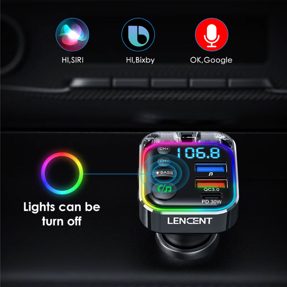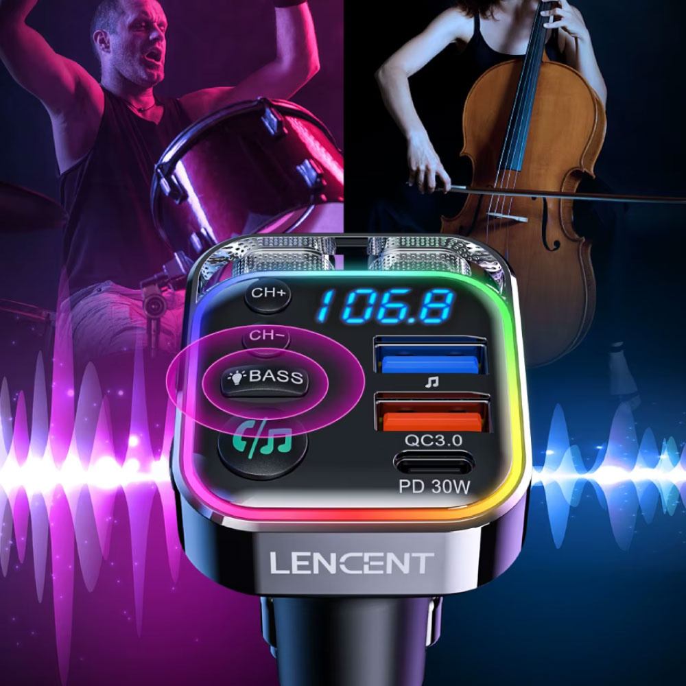 Maak van elke autorit een comfortabele én muzikale ervaring met de LENCENT Bluetooth FM Transmitter. Deze compacte alles-in-één autolader combineert handsfree bellen, Hi-Fi muziekstreaming en supersnel opladen in één stijlvol apparaat.