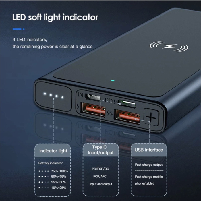 Bezprzewodowa Ładowarka Qi 10 000 mAh + Akumulator Awaryjny Power Bank - Bezprzewodowa Ładowarka PD QC3.0 Czarna