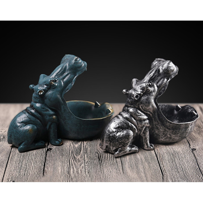 Figurka z żywicy przedstawia siedzącego hipopotama z otwartymi ustami, idealnego miejsca na przechowywanie kluczy. Figura ma 22 cm wysokości, 28,5 cm szerokości i 16 cm głębokości.