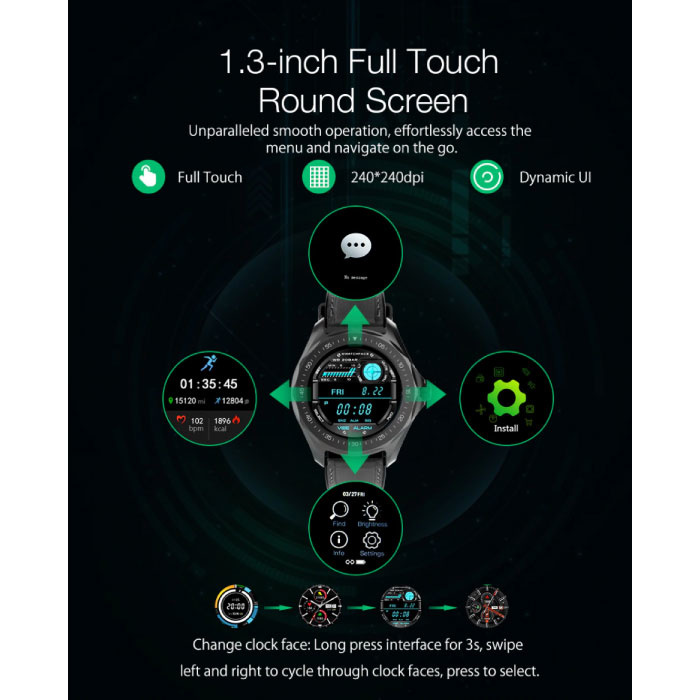 Dostępnych jest również wiele przydatnych aplikacji, takich jak; odtwarzacz muzyki, prognoza pogody, alarm, kalendarz i wiele więcej. Smartwatch jest wodoodporny IP68, odpowiedni do użytku w deszczu.