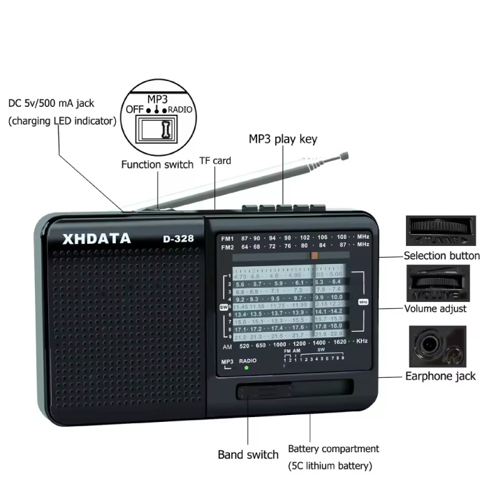 Niezależnie od tego, czy podróżujesz, biwakujesz, czy szukasz niezawodnego radia awaryjnego , XHDATA D-328 jest idealnym wyborem. Dzięki połączeniu doskonałego odbioru radia, obsługi plików MP3 i długiej żywotności baterii będziesz zawsze przygotowany.