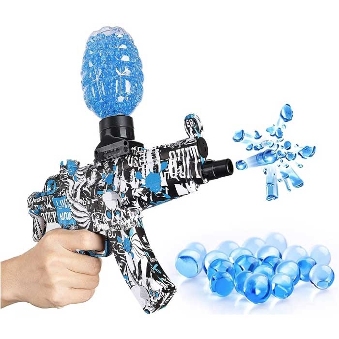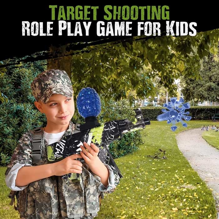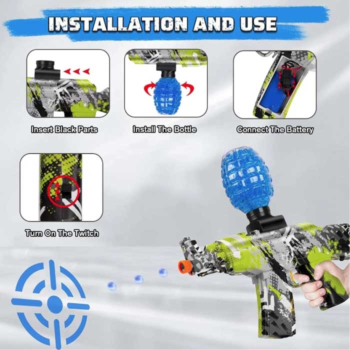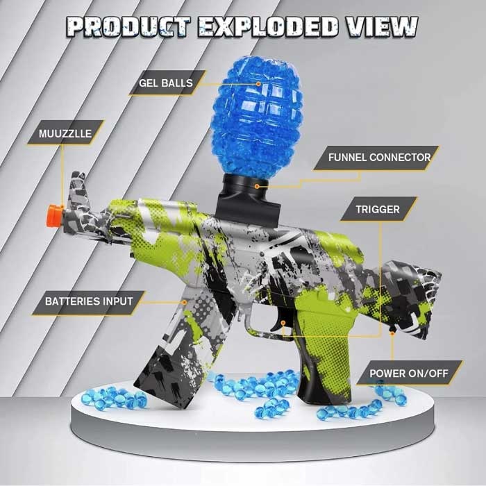 Ten pistolet żelowy ma ciekawy design, przypominający karabin AK47 , i stanowi fantastyczną alternatywę dla kulek paintballowych czy pistoletów Nerf – jest niedrogi i nie wymaga zbędnego czyszczenia. Śrut jest wykonany z bezpiecznego, nietoksycznego materiału żelowego i nie niszczy odzieży.