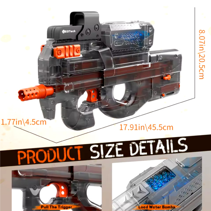 | Pakiet zawiera: | 1x P90 Elektryczny pistolet żelowy z akcesoriami 1x ładowarka USB |