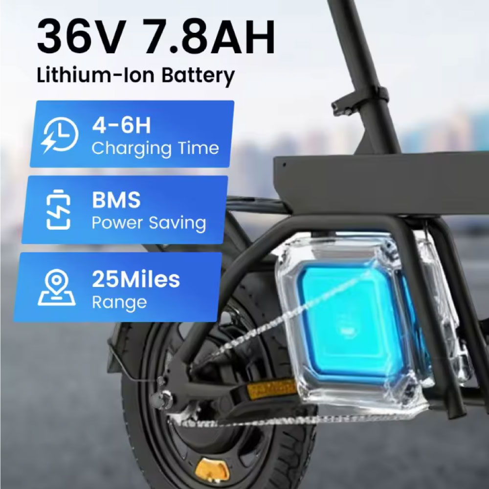 Dołączony akumulator 14,4 V 4 Ah zapewnia zasięg do 10 km , co jest idealne na dłuższe przejażdżki po okolicy lub w parku.