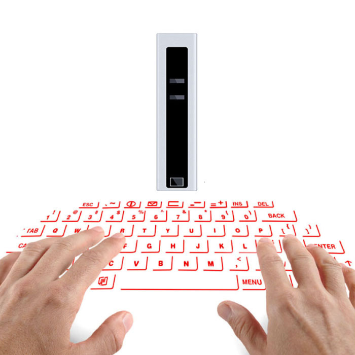 Klawiatura jest rzutowana na powierzchnię roboczą za pomocą wbudowanego nadajnika laserowego na podczerwień. Identyfikacja optyczna śledzi dokładnie to, co wpisujesz na klawiaturze. Niesamowity kawałek technologii!