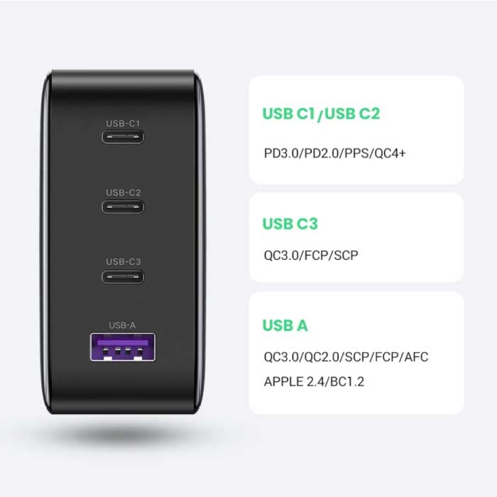 4-portowa ładowarka UGREEN to wysokiej jakości szybka ładowarka zasilana najnowszą technologią GaN, która umożliwia jednoczesne ładowanie do czterech urządzeń z ultraszybkimi prędkościami. GaN oznacza azotek galu, jest to materiał podobny do kryształu, który może obsługiwać znacznie wyższe napięcie niż jest to możliwe w przypadku ładowarek.