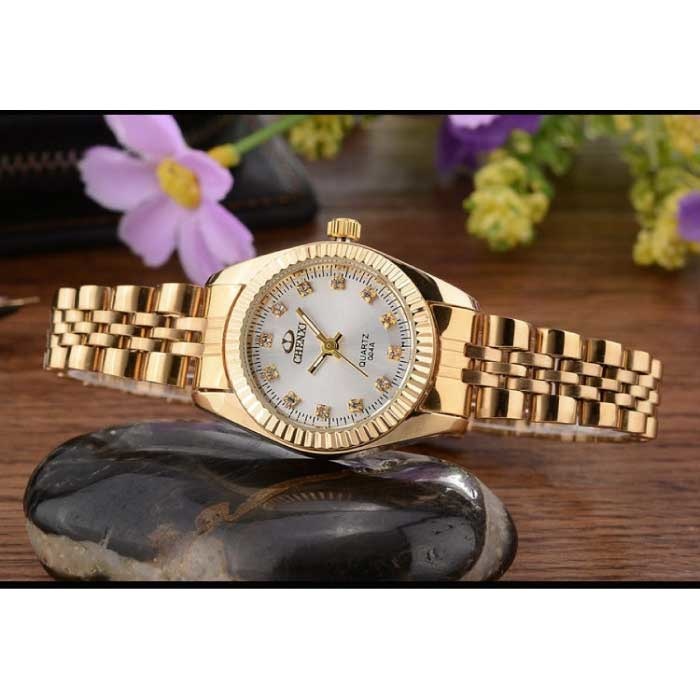 Złoty luksusowy zegarek dla kobiet - wodoodporny zegarek z kryształu górskiego Bransoletka ze stali nierdzewnej Złota