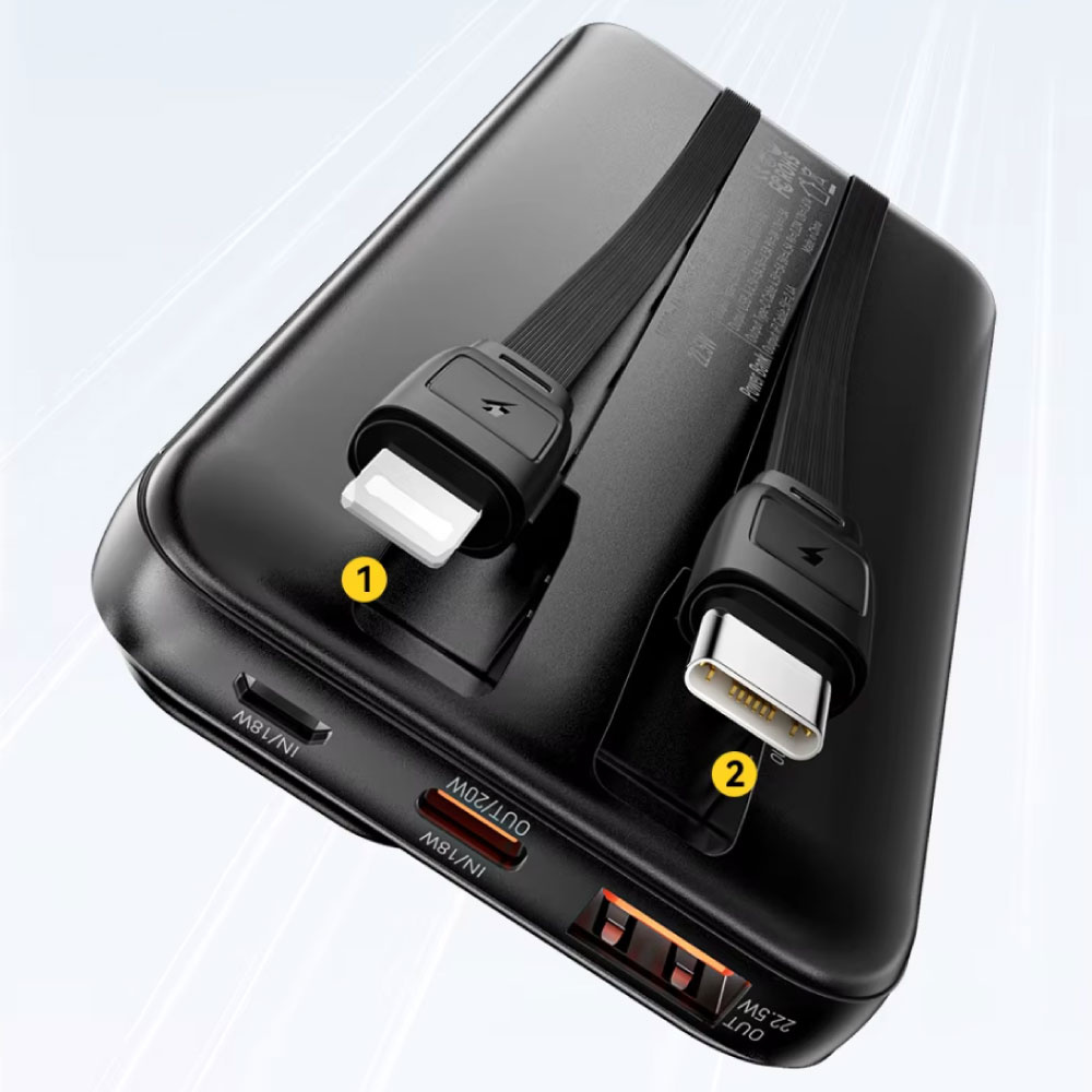 Powerbank jest dostępny w wersjach o pojemności 10 000 mAh i 20 000 mAh , dzięki czemu możesz wybrać, ile dodatkowej pojemności potrzebujesz. Dzięki wbudowanym kablom USB-C i Lightning zawsze masz pod ręką odpowiednie połączenie – koniec z luźnymi kablami.