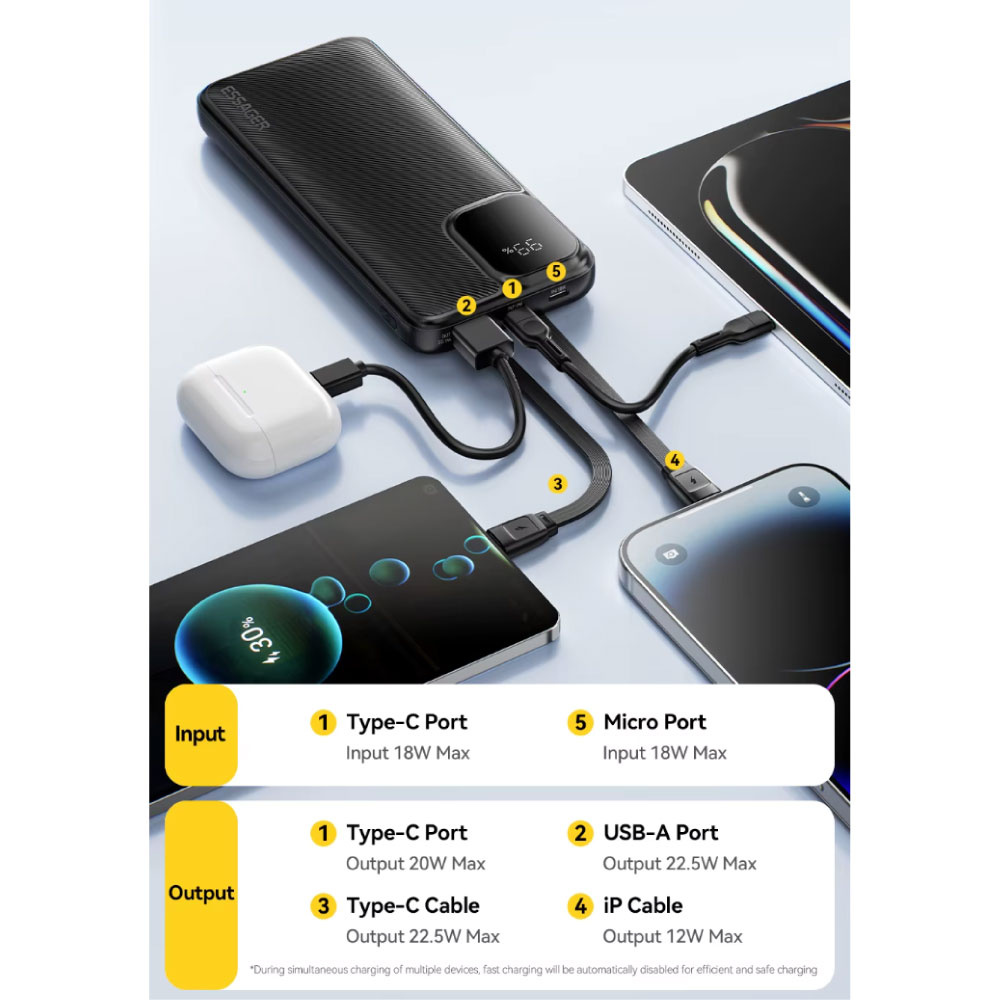 Essager Powerbank 22,5 W PD Szybkie ładowanie - 10 000 mAh - 2 porty ładowania i 2 kable - Zewnętrzna ładowarka akumulatora - Czarny