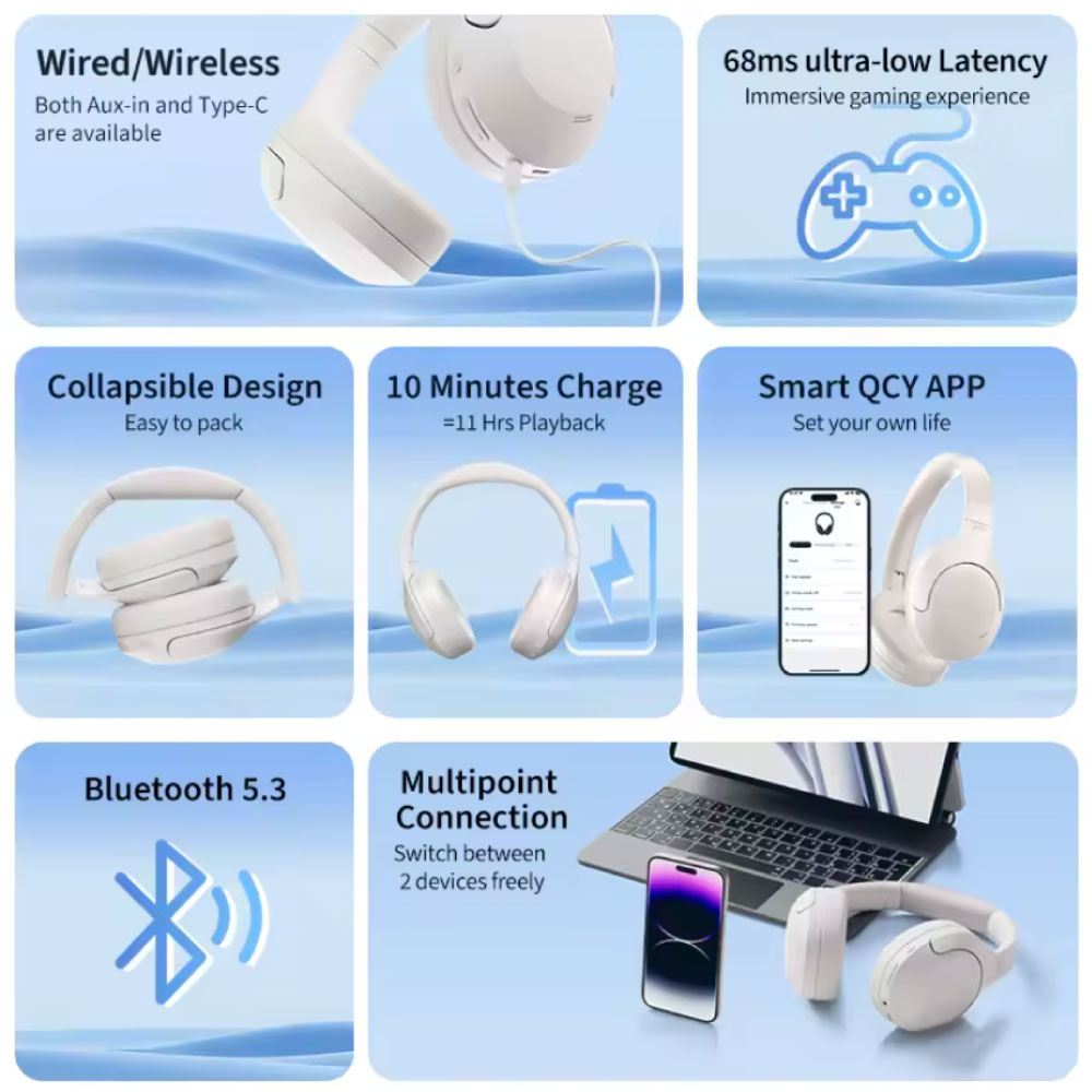 QCY H3 Lite łączą w sobie wysoką jakość dźwięku, aktywną redukcję szumów i długi czas pracy na baterii, tworząc wygodne i nowoczesne słuchawki. Niezależnie od tego, czy słuchasz muzyki, grasz, uczysz się, czy jesteś w podróży, te słuchawki zapewniają wciągające wrażenia słuchowe z minimalnymi zakłóceniami.