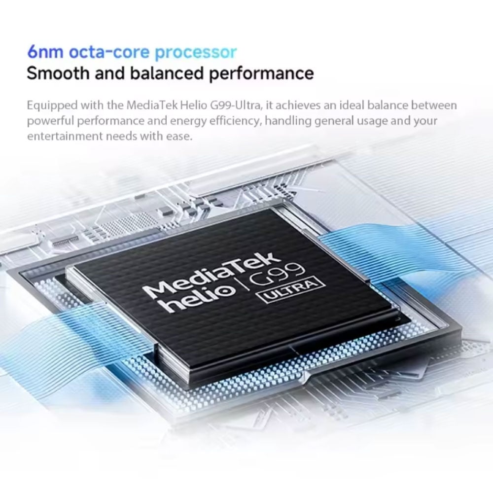 Pod maską wydajny procesor MediaTek Helio G99-Ultra zapewnia szybką wydajność i energooszczędność. W połączeniu z 6 GB pamięci RAM i 128 GB pamięci masowej, masz mnóstwo mocy i miejsca na aplikacje, zdjęcia, filmy i pliki.