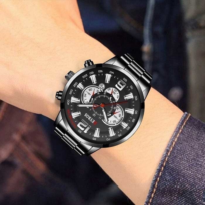 Sportowy zegarek ze stali nierdzewnej dla mężczyzn - kalendarz z mechanizmem kwarcowym Świecący zegar Skóra Czarne złot