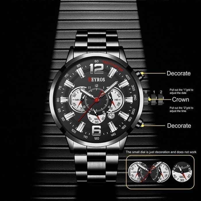 Ten luksusowy zegarek marki DEYROS oferuje dwie różne opcje: pasek ze stali nierdzewnej lub pasek skórzany. Każdy szczegół zegarka został starannie dopracowany, aby projekt miał swój własny.