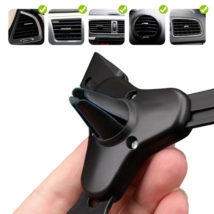 Uchwyt na telefon jest uniwersalny, pasuje do wszystkich telefonów i smartfonów, szerokość uchwytu jest automatycznie dostosowywana w celu zapewnienia dobrego chwytu, dzięki czemu telefon nigdy się nie poluzuje. Uchwyt można bezpiecznie przymocować do deski rozdzielczej za pomocą poręcznego zatrzasku nawiewu.
